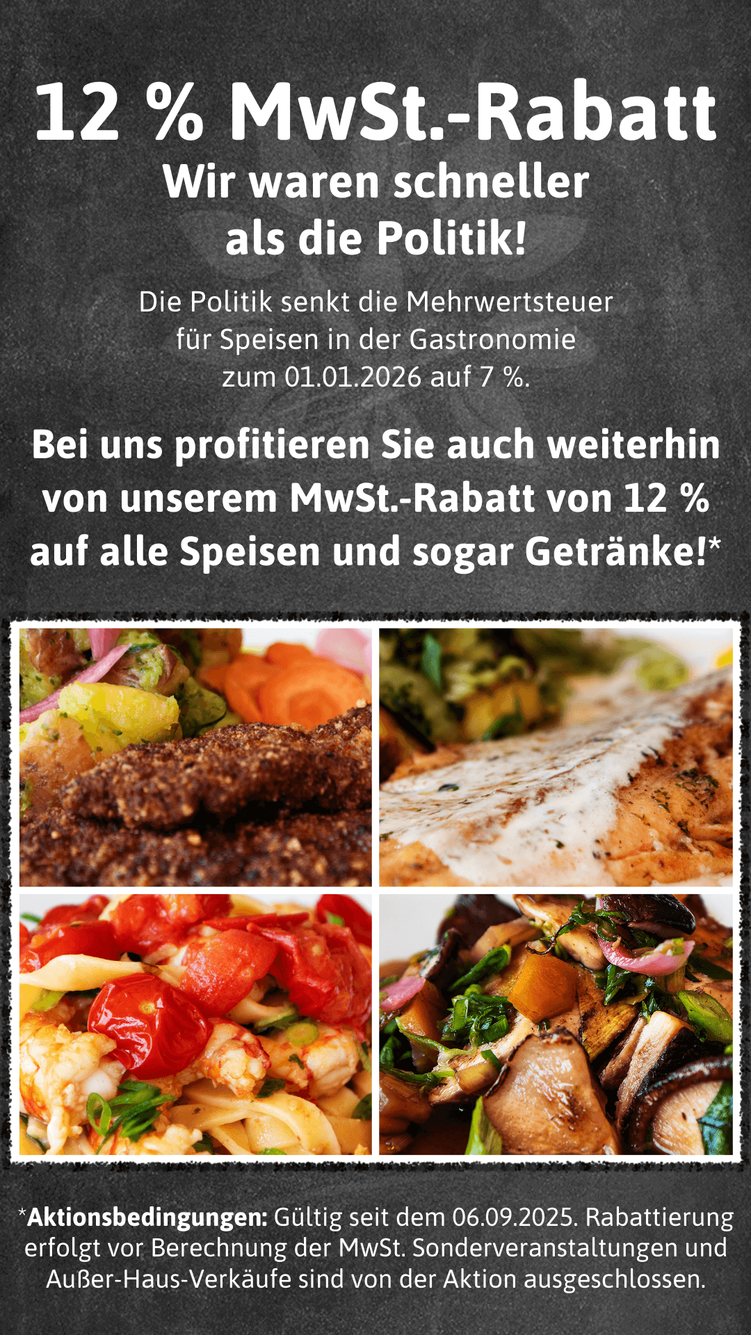 Wir waren schneller als die Politik! Seit September 2025 gewähren wir einen MwSt.-Rabatt von 12 % auf alle Speisen und sogar Getränke. Sie profitieren auch weiterhin von unserem MwSt.-Rabatt!